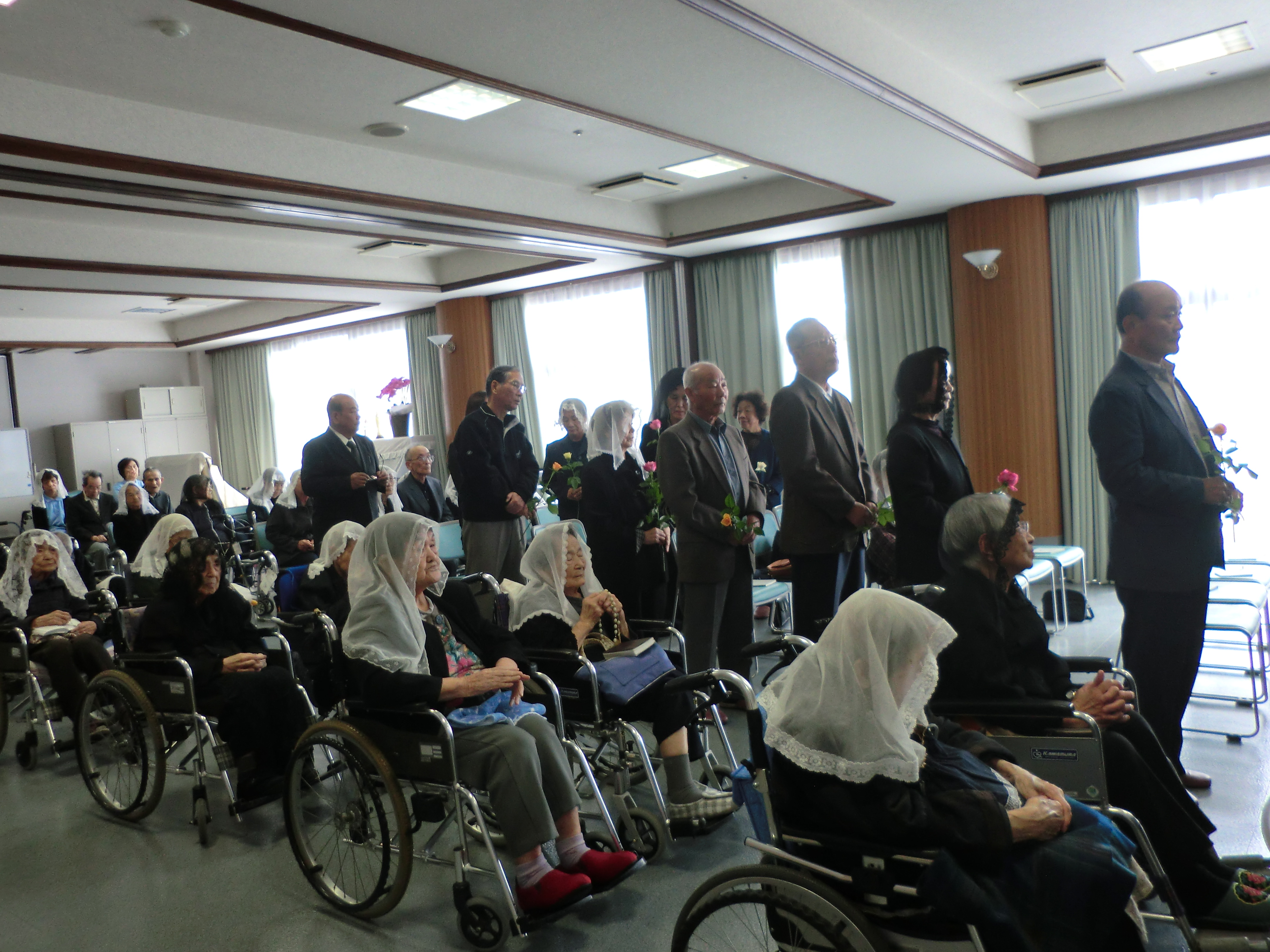 お知らせ 聖マルコ園 追悼祭 2015年11月4日 平成27年11月2日(月)11時~ 今年も死者の月を迎え、聖マルコ園でも亡くなった方々をしのんで ミサが捧げられました。 今回は、亡くなった方々のためにバラで献花をしました。 亡くなった利用者のご家族、利用者、職員がともに集い祈りました。 11月3日は、野道の墓地でド・ロ神父様の追悼ミサが捧げられ、参列しました。